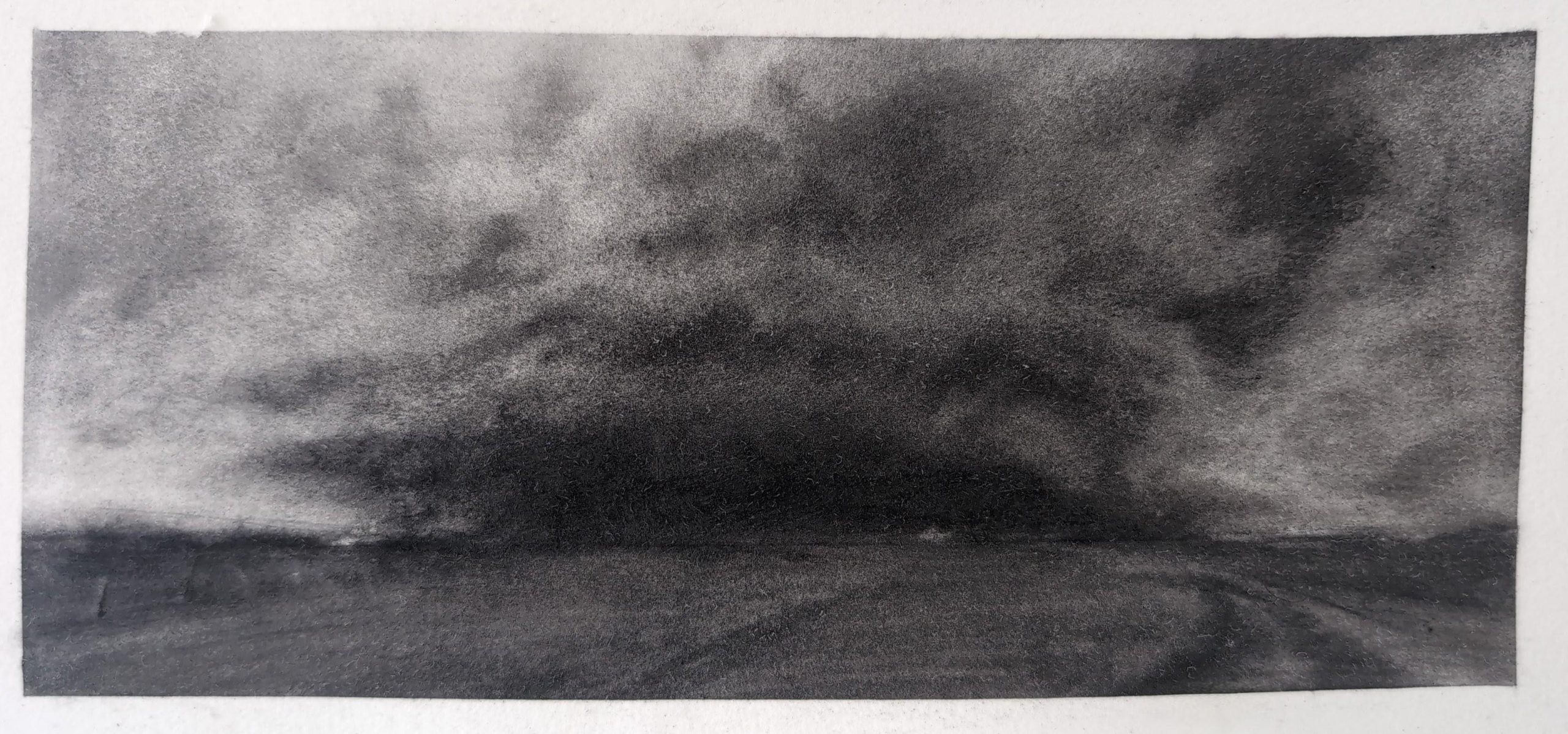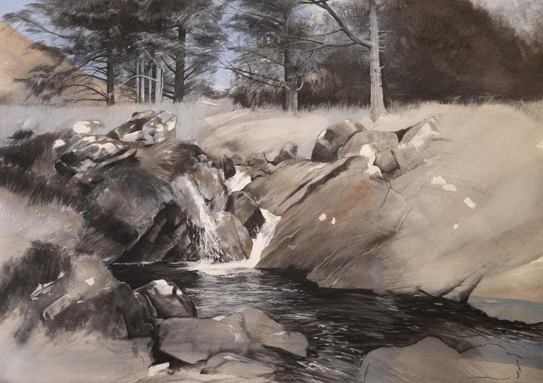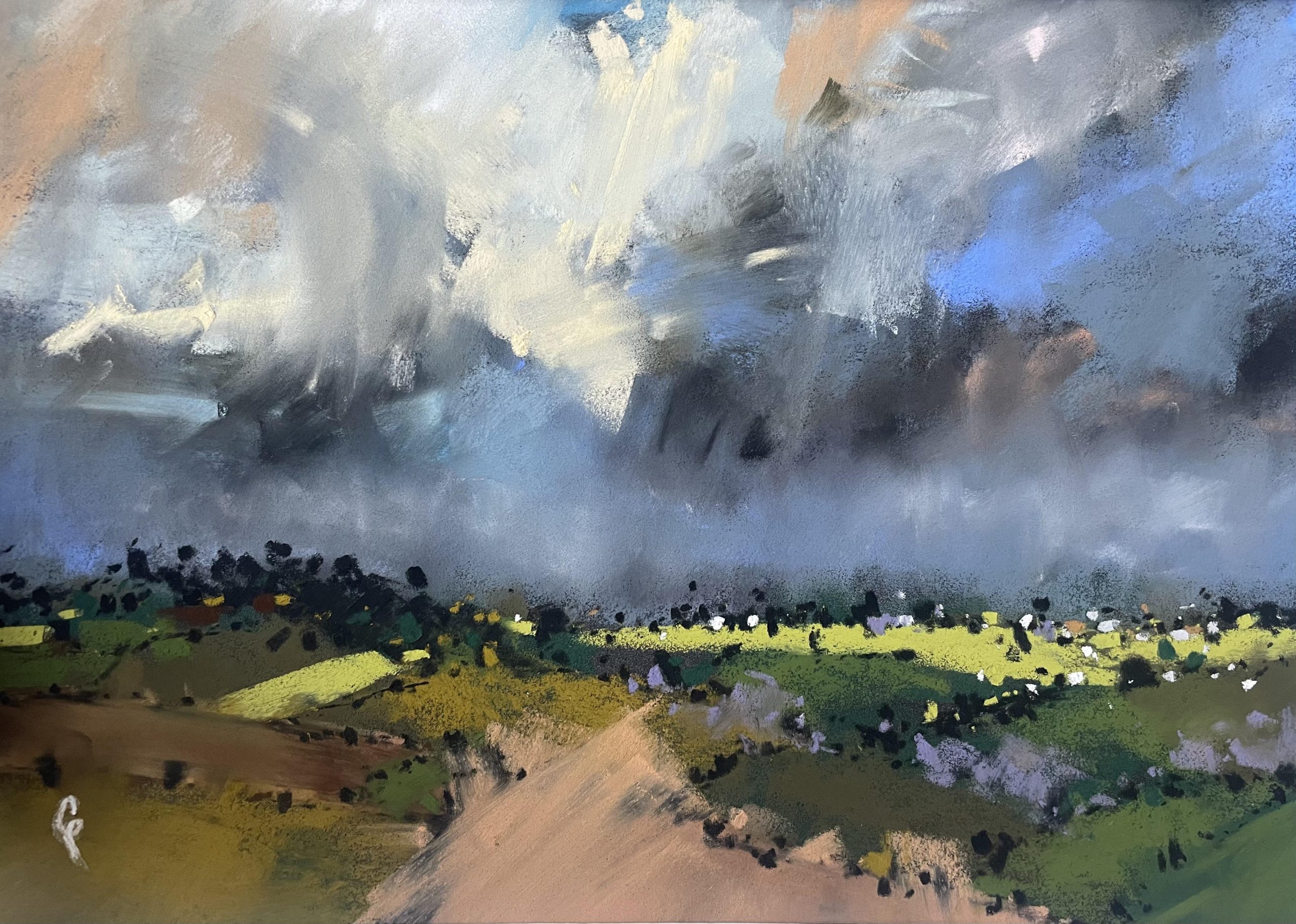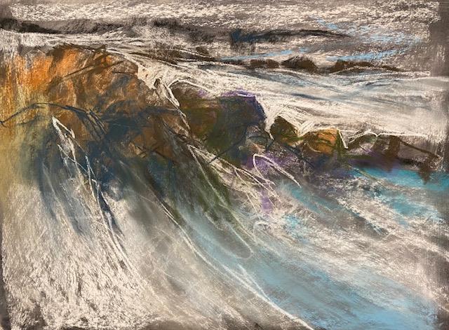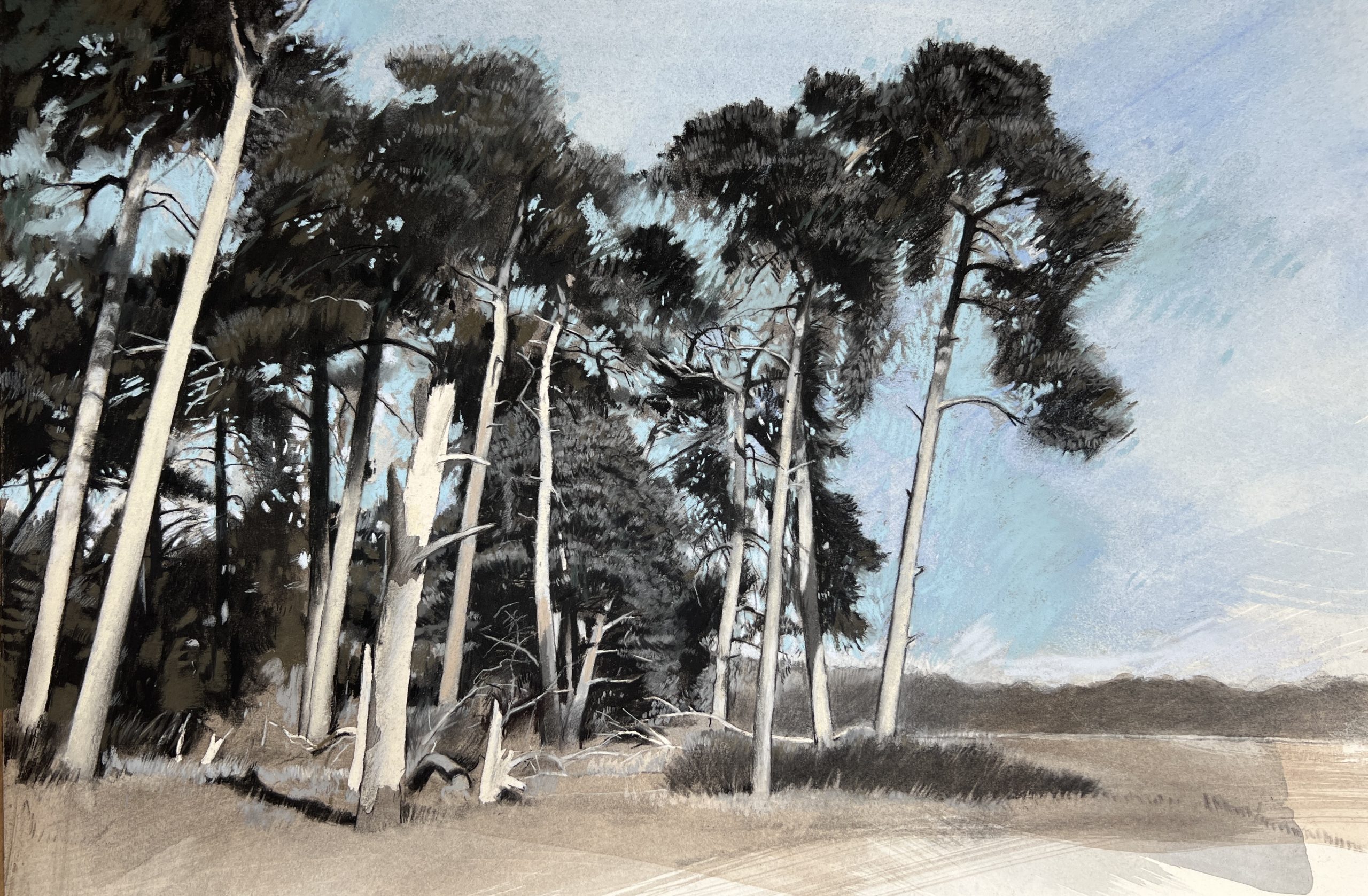 I am most attracted to landscape subjects from rural East Anglia, Wales, Scotland and Southern Ireland which I execute in a figurative way. The scenes I choose often speak to me as containing directional forces of energy which I interpret via relatively large, gestural brush strokes which I lay down first (liquid charcoal and watercolour). Whilst seemingly unnecessary to the onlooker, these marks provide a structural dynamic which feeds my mark making process and wherever preserved, are allowed to counterbalance subsequent layers of finer drawing work in charcoal and pastel. Colour is often minimised in preference to bold, graphic, blacks, blues, browns, light greys and whites. I aim to create drama in my work.