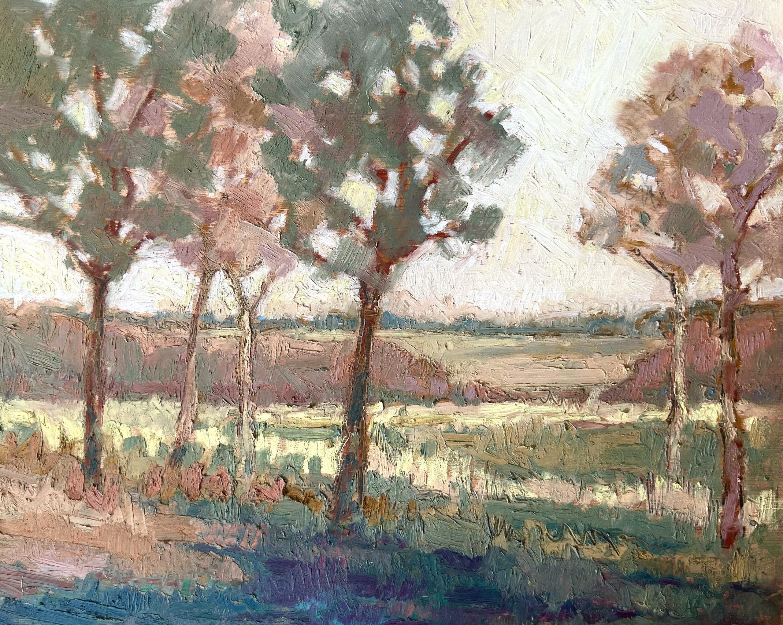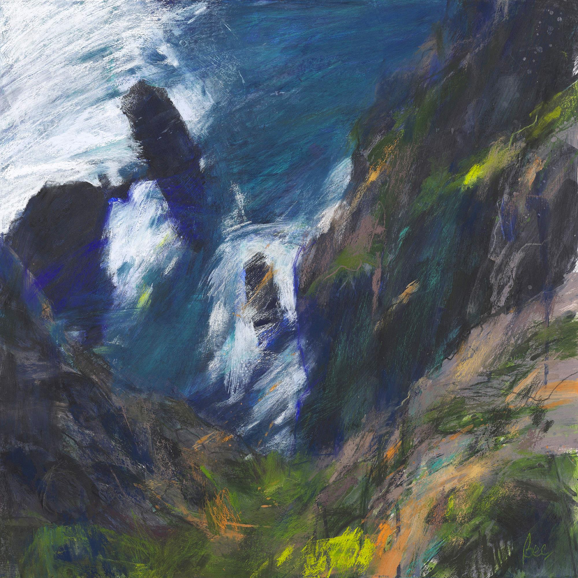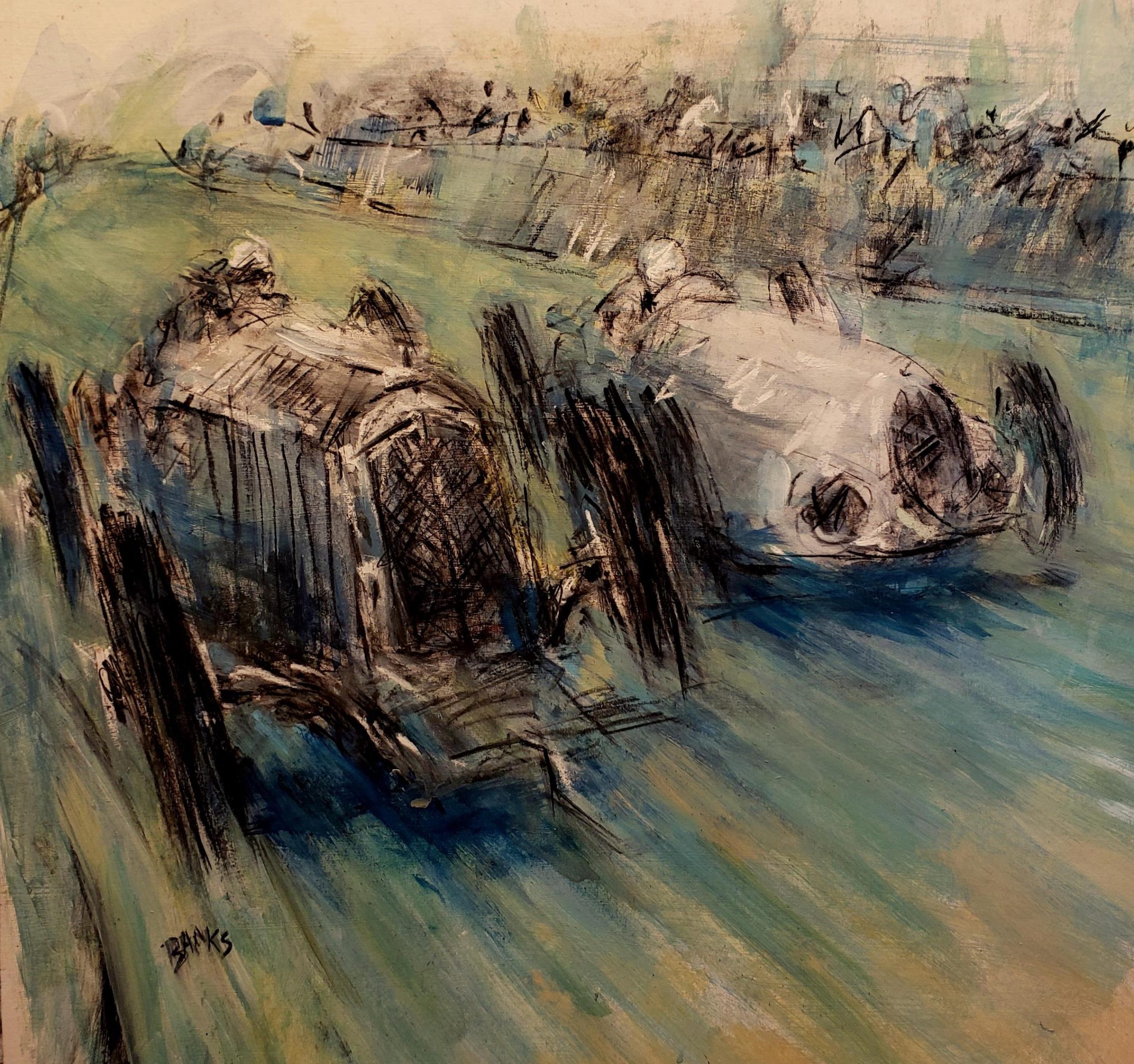 I am most attracted to landscape subjects from rural East Anglia, Wales, Scotland and Southern Ireland which I execute in a figurative way. The scenes I choose often speak to me as containing directional forces of energy which I interpret via relatively large, gestural brush strokes which I lay down first (liquid charcoal and watercolour). Whilst seemingly unnecessary to the onlooker, these marks provide a structural dynamic which feeds my mark making process and wherever preserved, are allowed to counterbalance subsequent layers of finer drawing work in charcoal and pastel. Colour is often minimised in preference to bold, graphic, blacks, blues, browns, light greys and whites. I aim to create drama in my work.